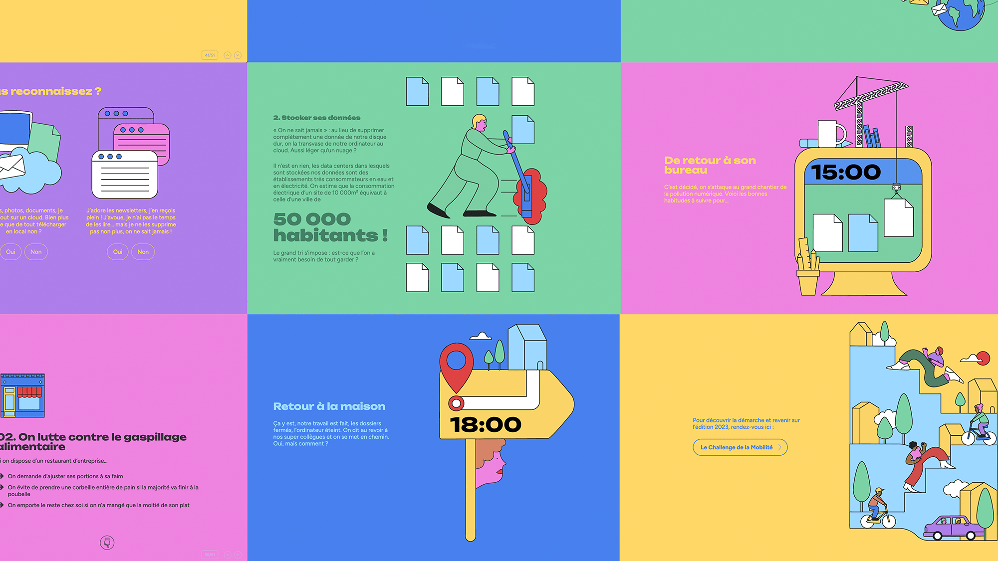 Illustrations and motion design made for the infographic on health and urbanism, food consumption, fishing, meat, digital pollution, sand, water as well on smarthphone and work. Art direction on social media posts, story and newsletter.