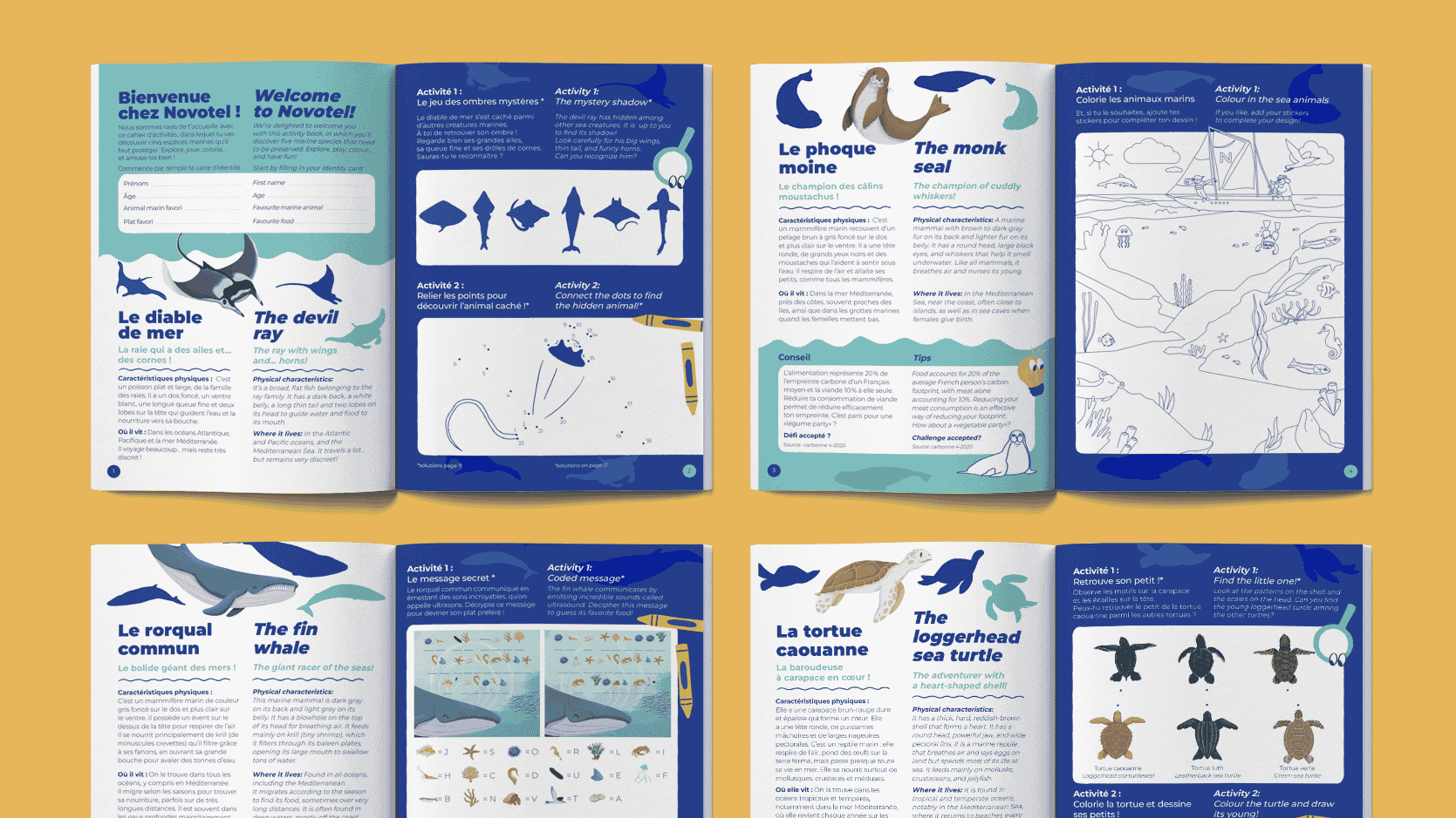 Illustration and editorial design for Novotel in partnership with WWF. This activity handbook for children aims to raise awareness about protecting the oceans through games and quizzes. Translated in english and french.