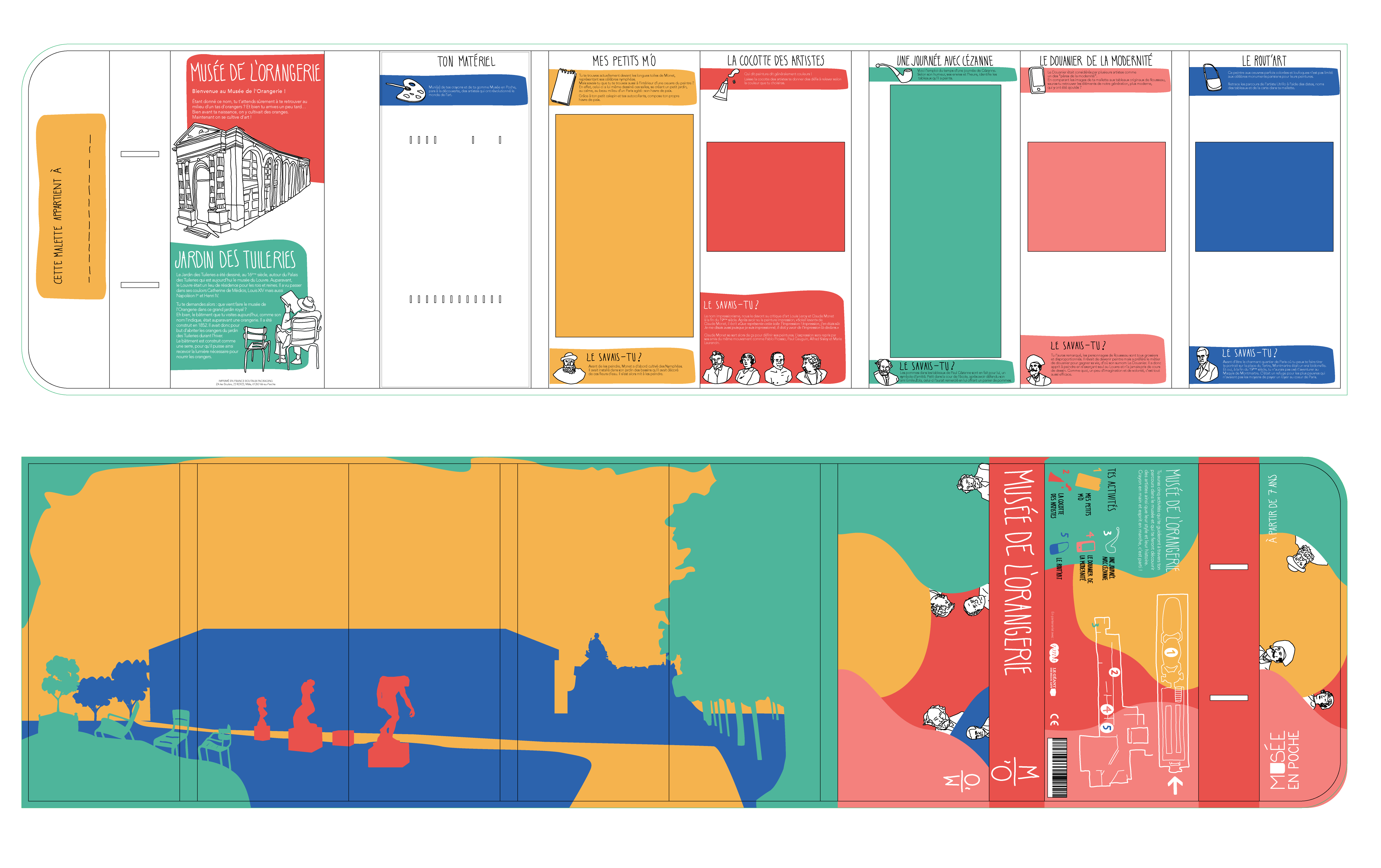 This project was developed around the Musée de l'Orangerie in Paris. As a group, it was a question of designing and producing packaging intended for children, from the age of 7, who are then able to read and sensitive to graphics. This packaging, in the form of a small suitcase, offers equipment and five activities to do in the museum for some, and which can be continued at home for others. This project will be offered at the Musée de l'Orangerie , and a partnership is possible with the museum of modest arts of the city of Sete. Project made with Romane Mercadal and Ambre Pichereau, with the help of Lucie Buseine.