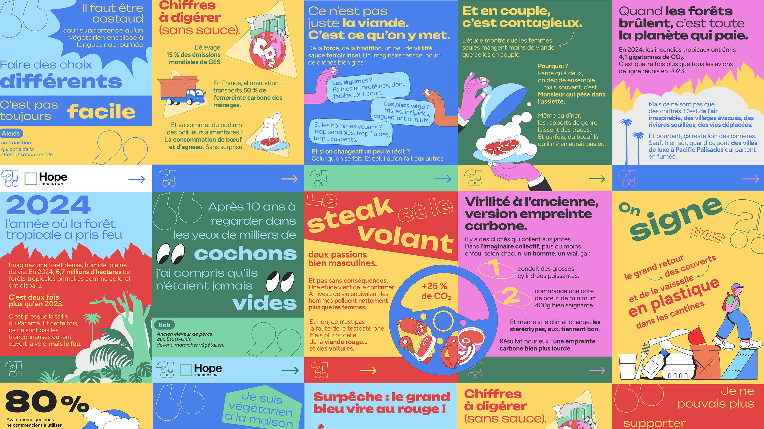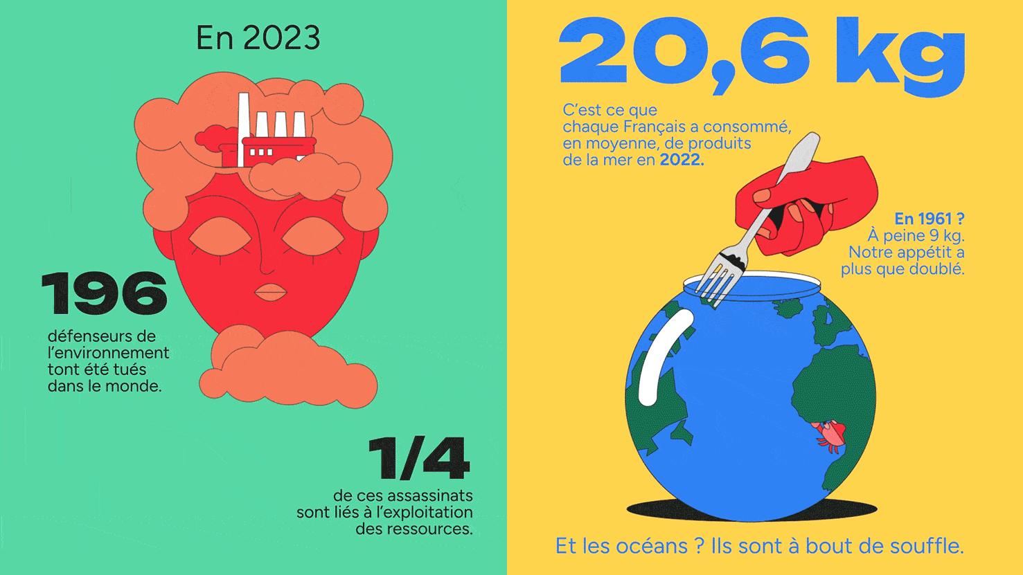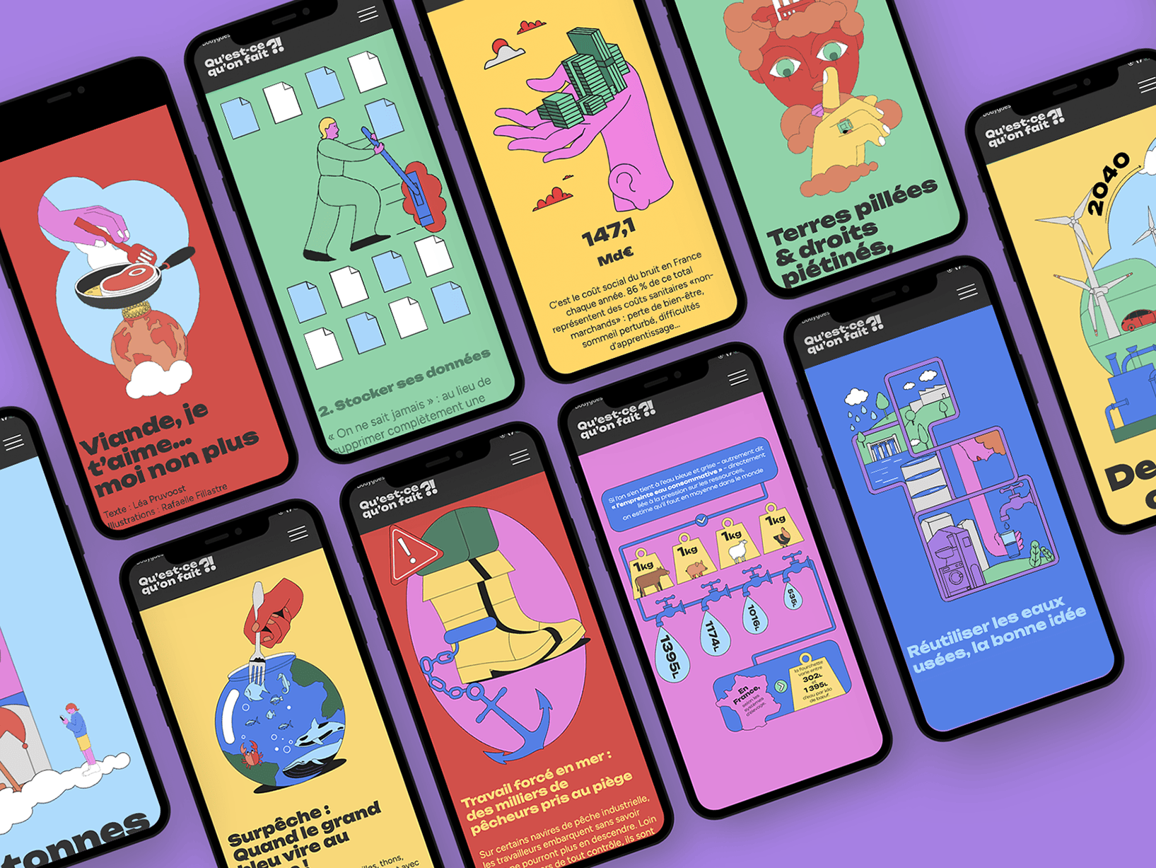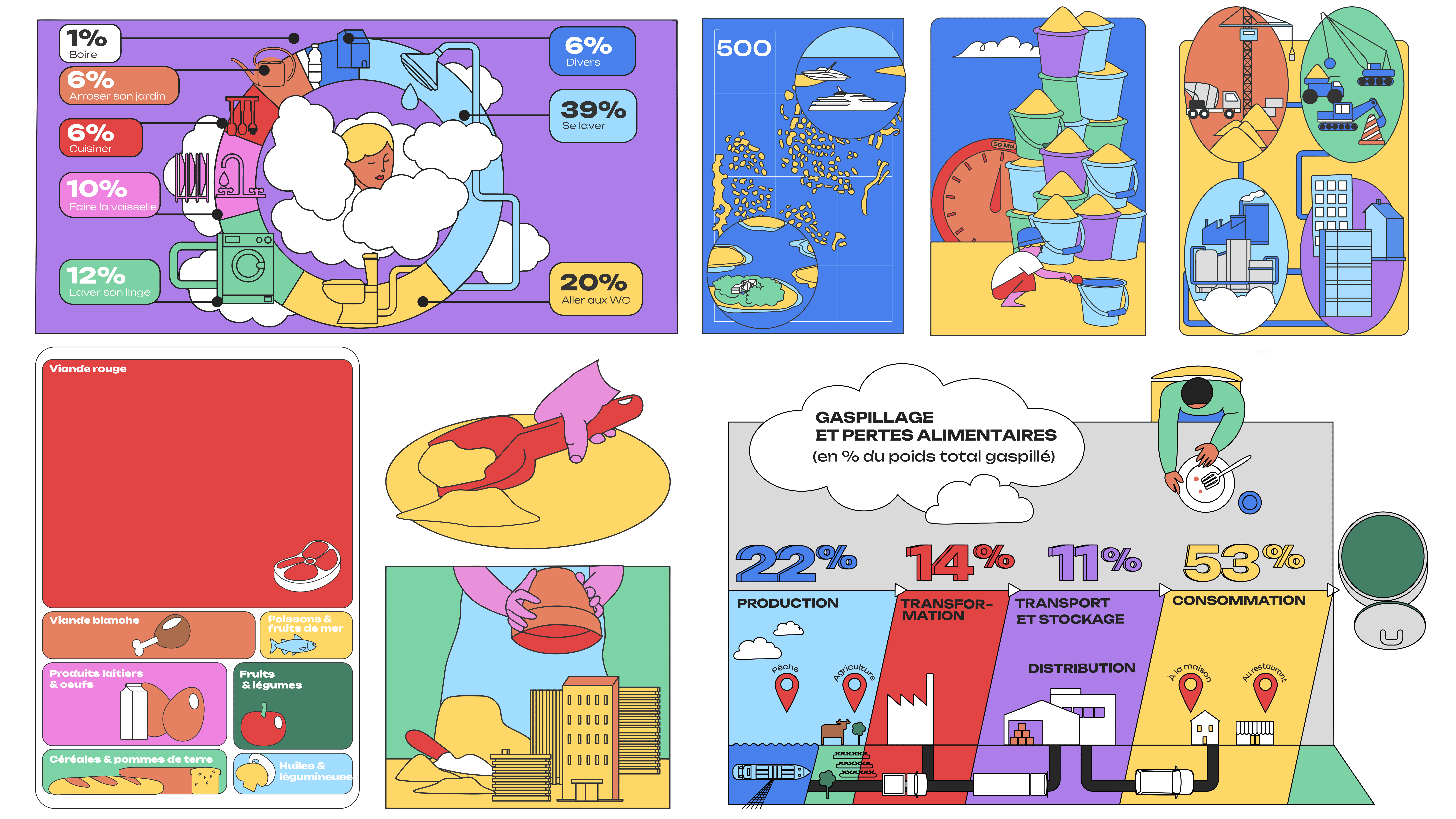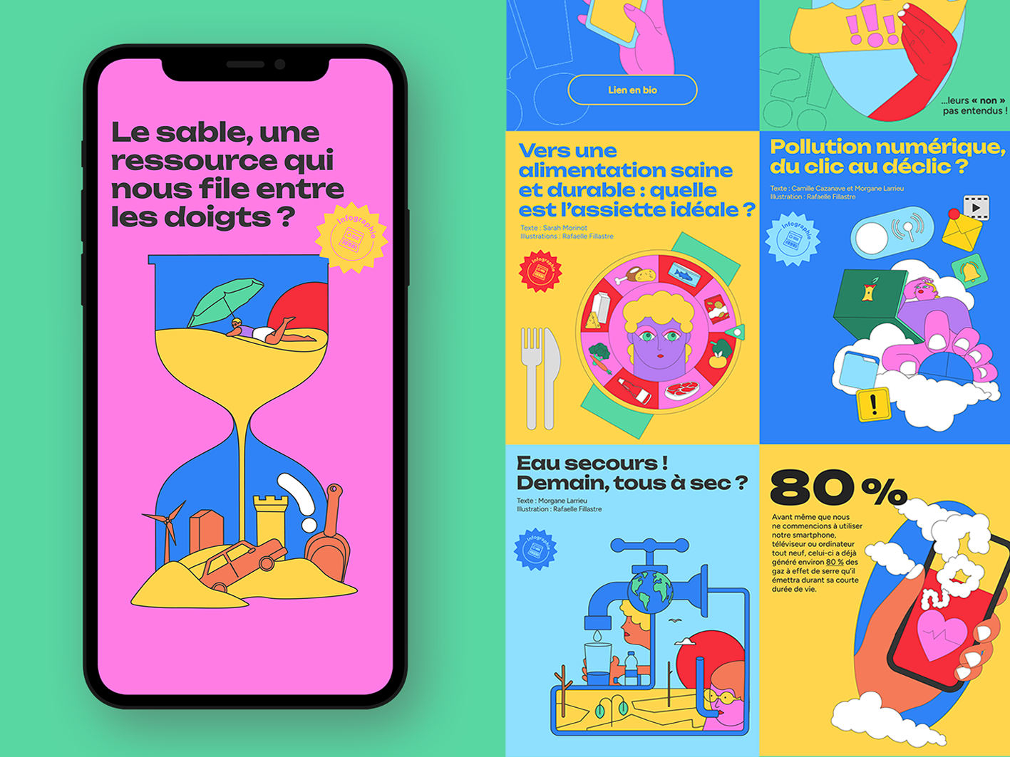 Illustrations and motion design made for the infographic on health and urbanism, food consumption, fishing, meat, digital pollution, sand, water as well on smarthphone and work. Art direction on social media posts, story and newsletter.